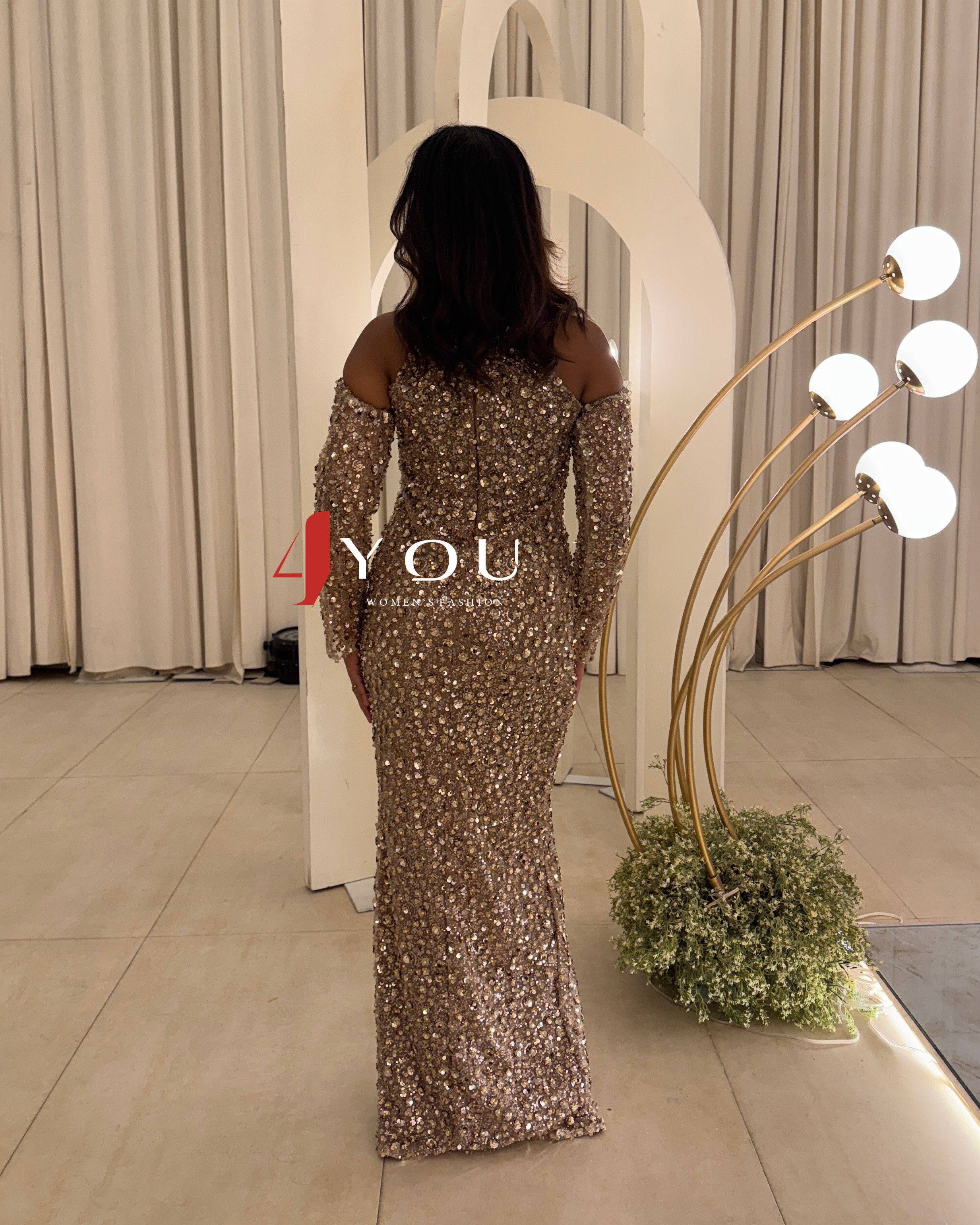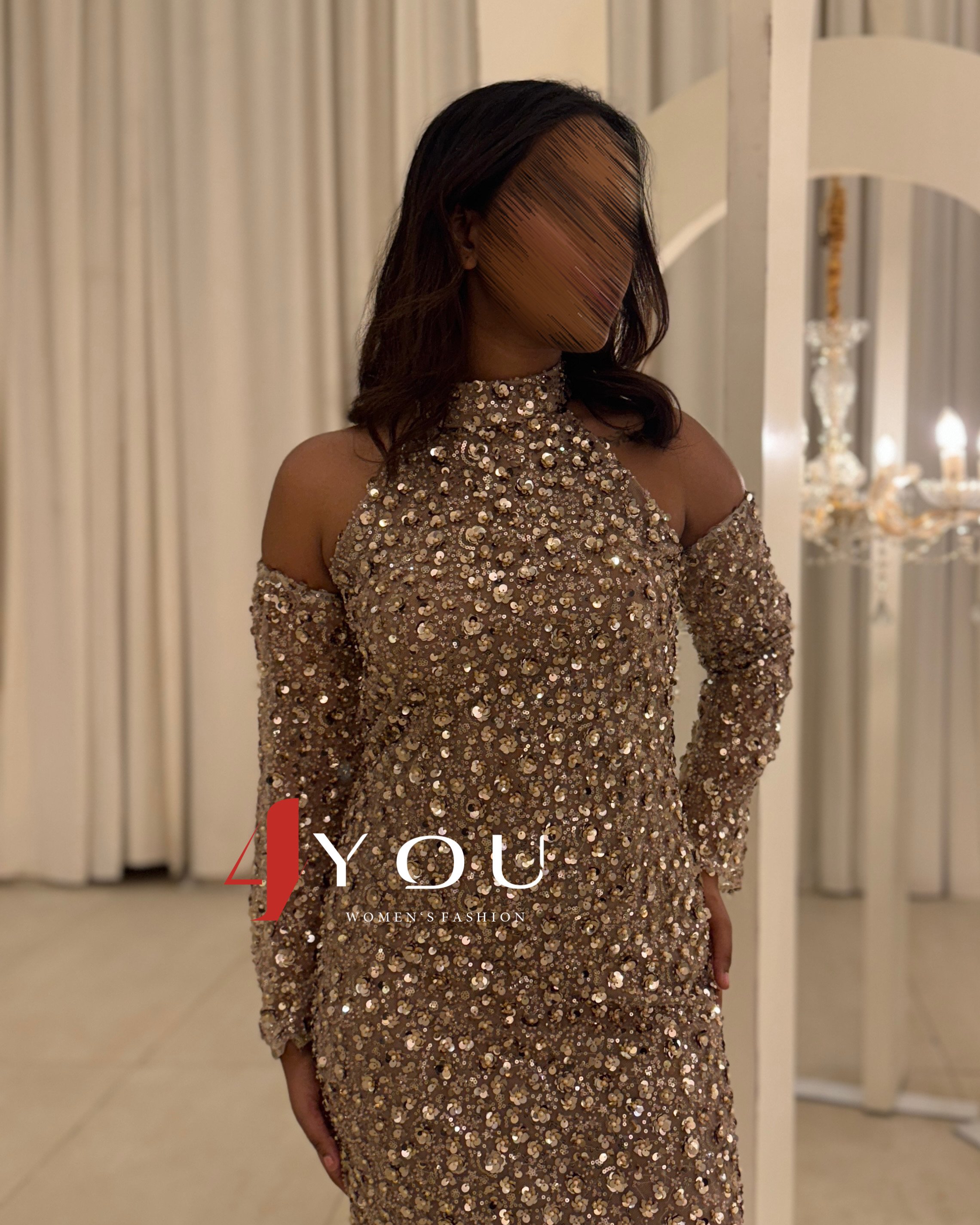 تألقي بأناقة استثنائية مع هذا الفستان الذهبي الفاخر، المصمم بقصة طويلة أنثوية مطرزة بالكامل بالترتر اللامع لإطلالة تخطف الأنظار. يتميز بقصة كتف ساقط مع ياقة عالية عصرية، وأكمام طويلة تزيد من فخامته، إضافة إلى فتحة أمامية أنيقة تمنحك مظهراً راقياً وجذاباً. فستان مثالي للأعراس، حفلات السهرة، والمناسبات الفاخرة حيث يجمع بين الفخامة واللمسة العصرية.
