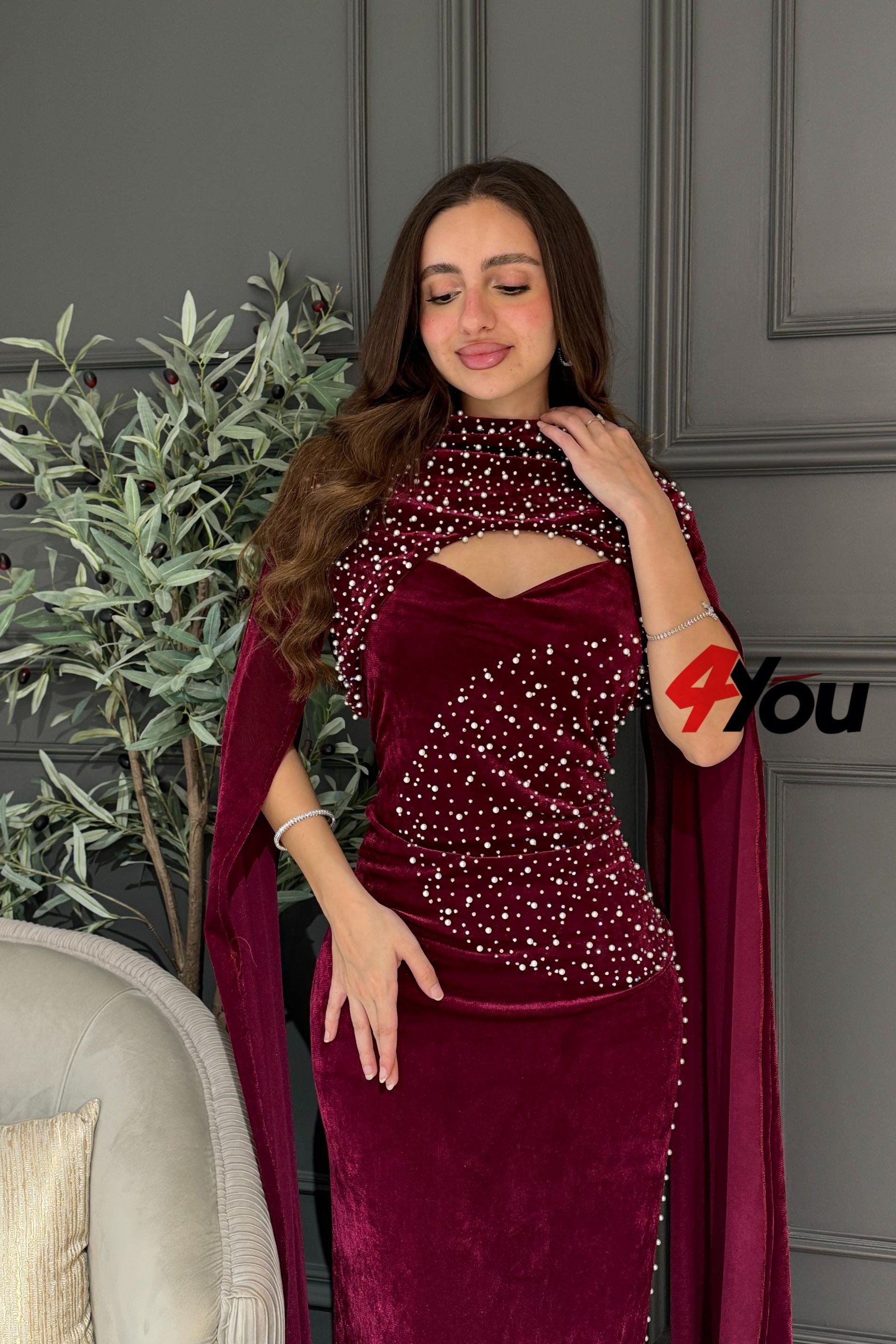 احصلي على إطلالة ملكية ساحرة مع هذا الفستان المخملي الفاخر باللون العنابي الغني، يتميز بتصميم ضيّق يبرز القوام الأنيق وتطريز فخم بفصوص لامعة تضفي لمسة من البريق والفخامة. يأتي مع كاب انسيابي من نفس القماش يكمّل جمال التصميم ويمنحك حضوراً فريداً في المناسبات الراقية والسهرات الخاصة.
