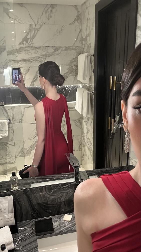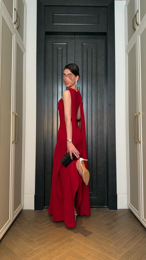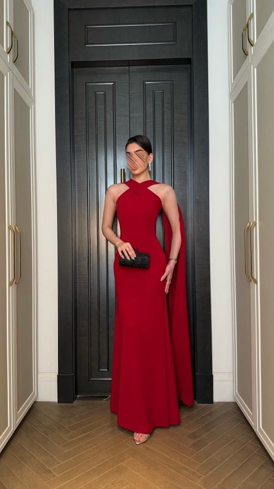 فستان سهرة طويل باللون الأحمر الملكي بتصميم راقٍ يلفت الأنظار، يتميز برقبة متقاطعة أنيقة تبرز جمال الأكتاف والصدر مع قصة ضيقة تنحت القوام. يضفي الكاب الجانبي الطويل لمسة فخامة ملكية تضاعف من أناقة الإطلالة، ليكون خيارًا مثاليًا للمناسبات الفاخرة، حفلات الزفاف والسهرة. تصميم يجمع بين البساطة والرقي لإطلالة لا تُنسى.